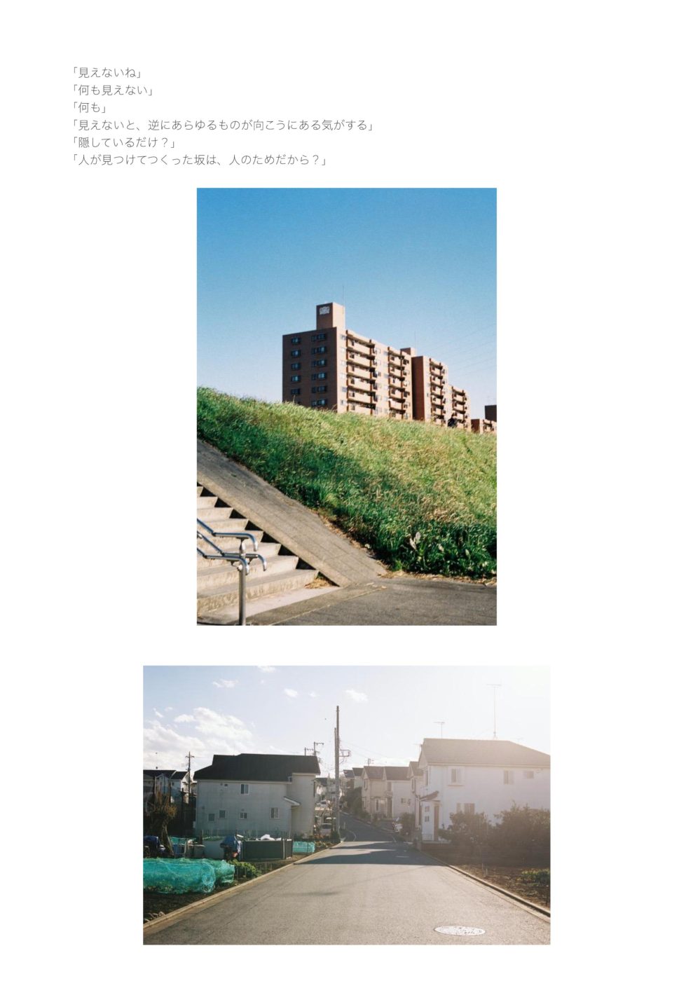 坂の定義「一方が高く、一方が低い」に加えて、「切り離された上と下をつなぎ、関係性を生み出すもの」と定義する。その関係性は重力及び重力を起因とした人間の身体やものの運動によってつくられていることが多い(坂道を発信する車や子供の身体、下水道etc.)