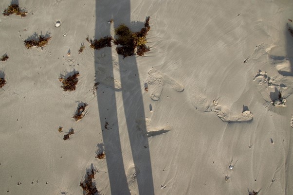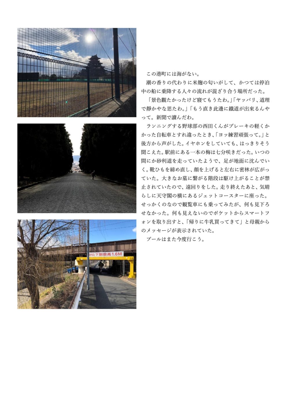 父にメッセージを打ちながら歩いていると、古い建物ばかりが立ち並ぶ路地に出た。たばこ屋、空き店舗、インドカレー屋、金物屋。昔は賑わった商店街だったのであろうか。メッセージを送信すると、すぐに視線を足下に移し、道を急いだ。水の流れる方向や水溜りの位置を頼りに、道の起伏を大雑把に把握する。可能な限り雨水が少ない箇所に右足を置く。視線は走り続け、次の瞬間には左足が在るべき場所に向かって動いている。そんな動作を繰り返していると、スニーカーの底が地面を擦り付ける感触に違和感を感じ始めた。意識を足底に移すと、今いる場所が微かな丘になっていることに、少し遅れて気がついた。高架線を走る電車が横を通り過ぎていった。電車に乗っている人と目が合った気がした。