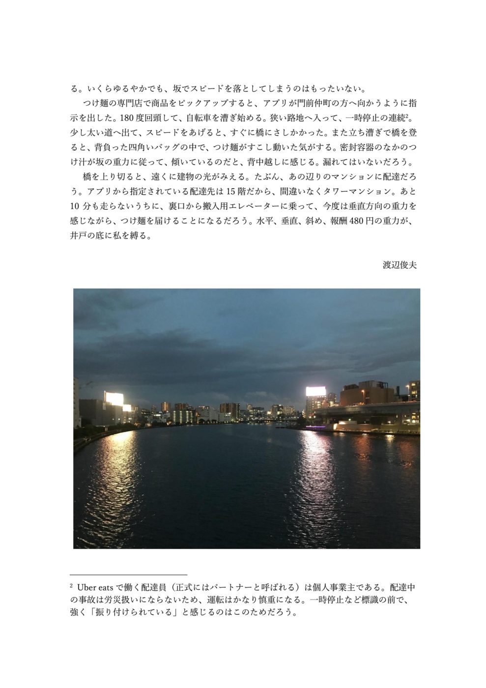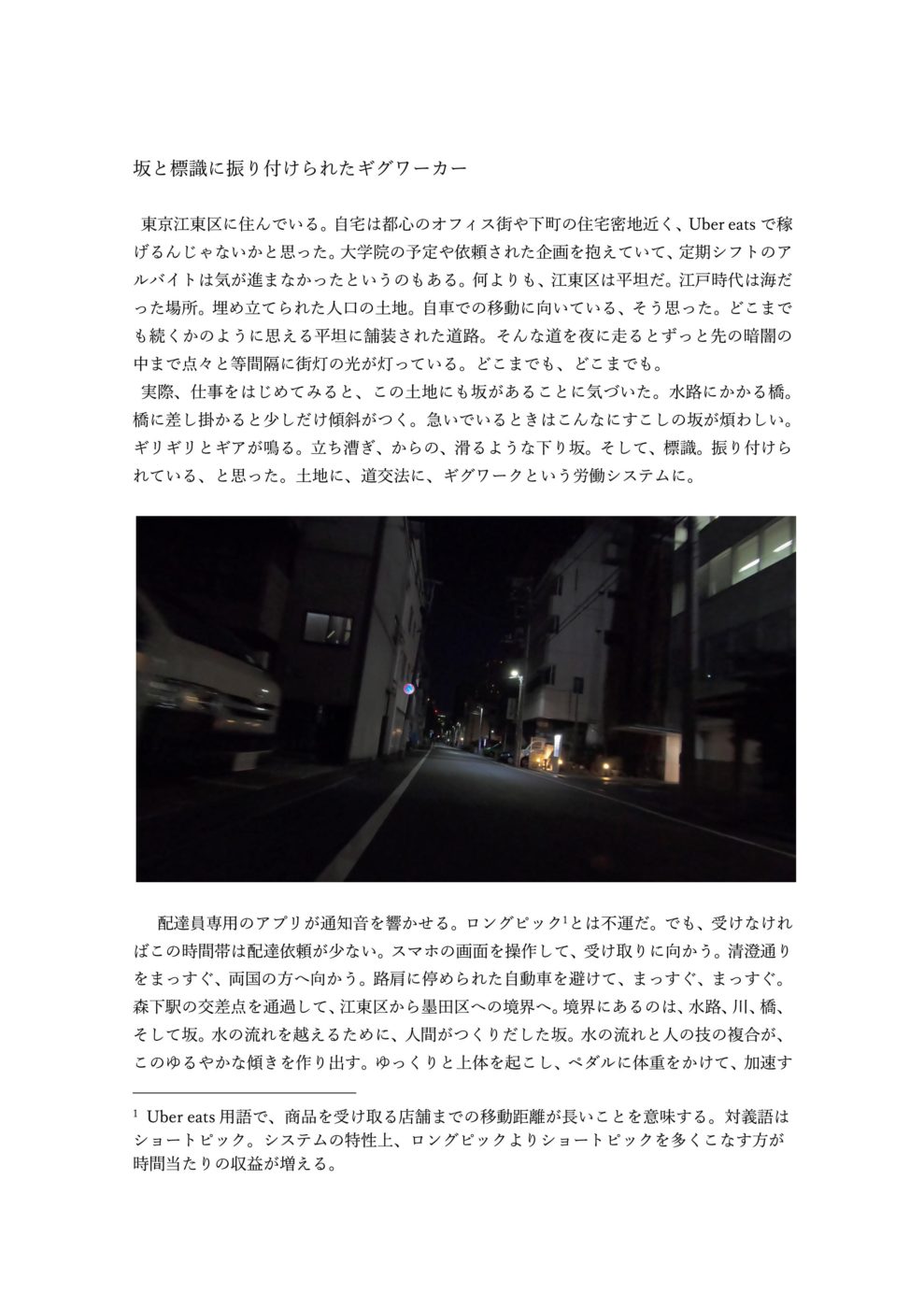 実際、仕事をはじめてみると、この⼟地にも坂があることに気づいた。⽔路と⽔路の間にかかる橋。橋に差し掛かると少しだけ⾼くなる。急いでいるときはこんなにすこしの坂が煩わしい。ギリギリとギアが鳴る。⽴ち漕ぎ、からの、滑るような下り坂。そして、標識。振り付けられている、と思った。⼟地に、道路交通法に、ギグワークという労働システムに。